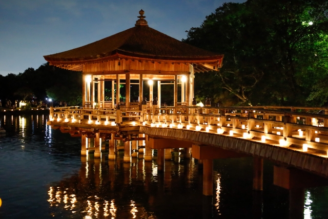 なら燈花会開催日:8月上旬 奈良公園が会場の夏の一大イベント。猿沢池、浮雲園地のほか、東大寺鏡池、春日大社参道などを幽玄の灯りで彩る火の祭典です。 |