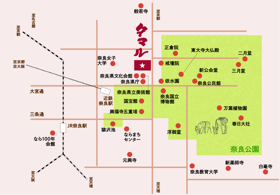 観光ホテルタマルは、奈良公園のほど近くに位置し、「古都奈良の文化財」として世界遺産に登録されている東大寺や興福寺、春日大社など多くの資産へ徒歩で訪れることができます。